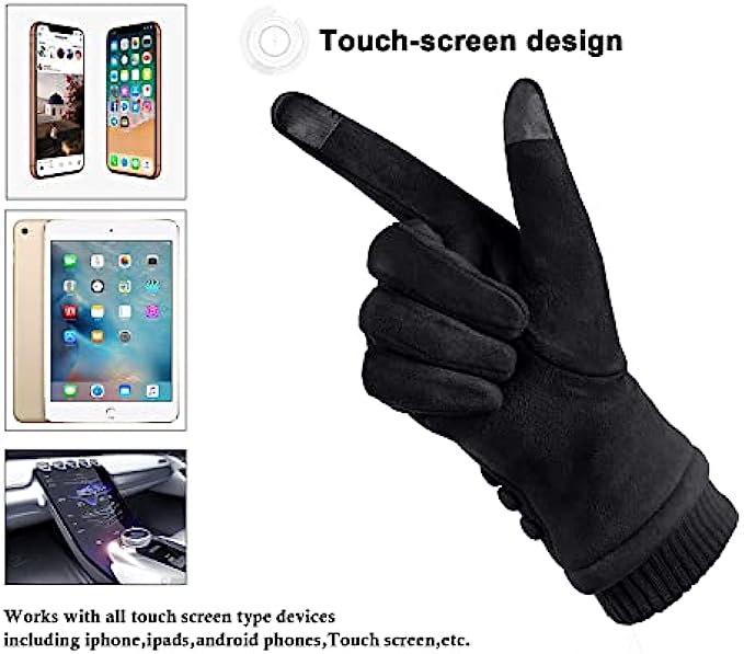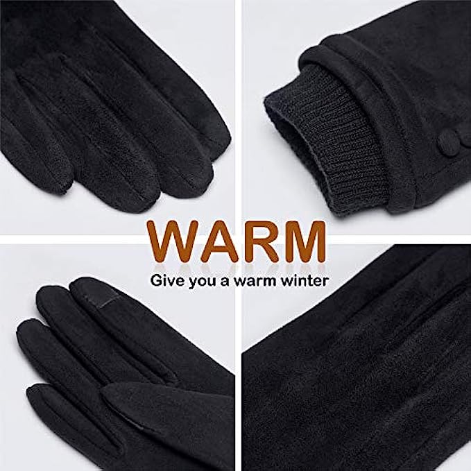 1.MATERIAL:Suede,Plush lining texture.This Soft full thick lining and classic design gloves will keeps your hands warm in the cold weather.